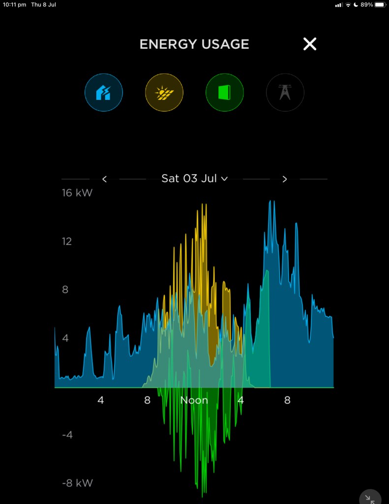 Our modelling indicated that our 21kW PVs were generating enough power to usefully support up to about 55kWh of battery storage, corresponding to 4 x Tesla PowerWall 2 batteries. In cost-benefit terms, a sweet-spot would be with 2 batteries. In the depths of winter in July – on many days – we’d still generate enough spare power to fully charge the batteries for use after sundown.