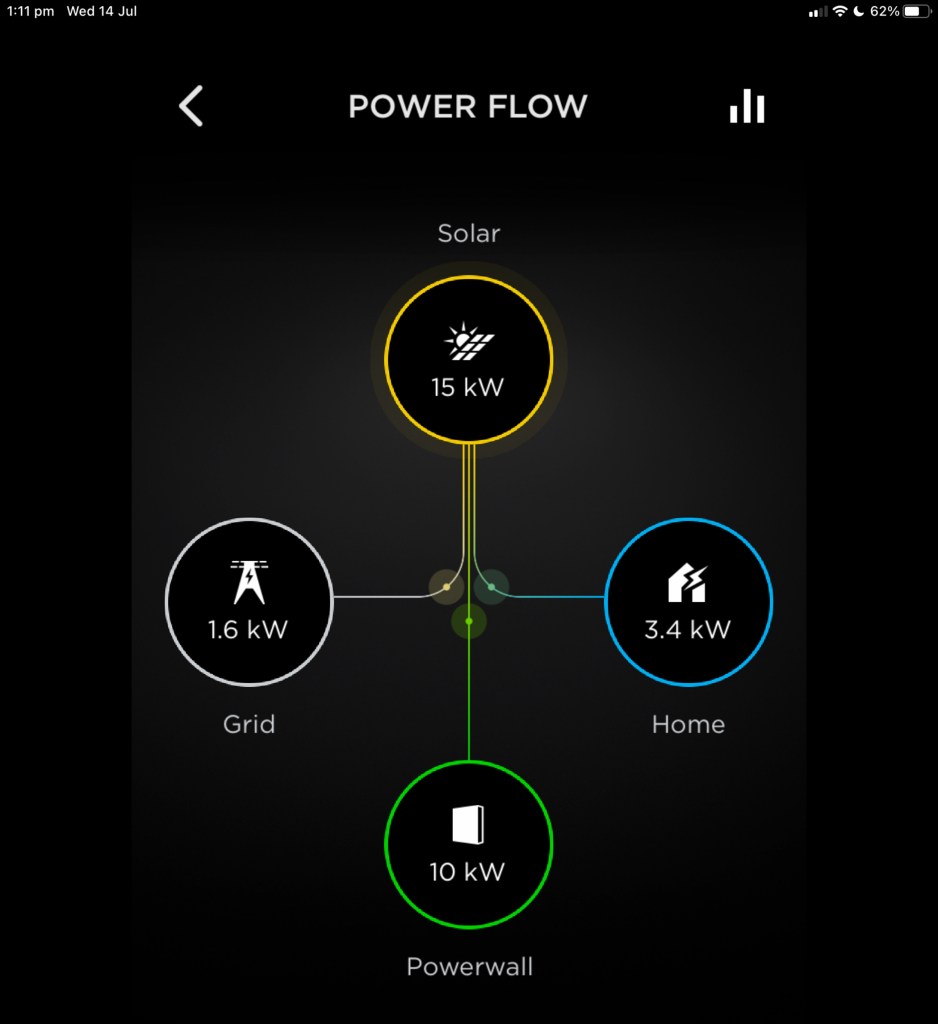 At present the Tesla App treats the two batteries as if they are one battery of double the size. This is fine for accumulation and export of performance data. But it means you can’t administer and monitor the batteries individually; whatever settings you apply are set to both batteries.